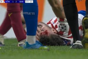 体育资讯04月15日讯 欧冠1/4决赛次回合,马竞vs巴萨,第69分钟,鲁杰里被加维肘击,倒地满脸是血,加维染黄!